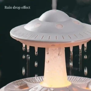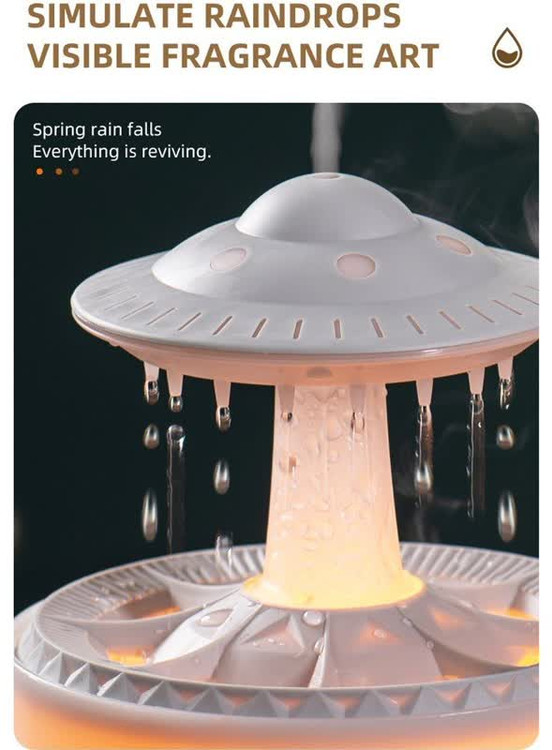 بخور و چراغ خواب بارانی cloud rain humidifier UFO دارای مخزنی بزرگ با ظرفیت 350 میلی لیتر است و همین امر باعث می شود تا از آن 10 ساعت استفاده مداوم داشته باشید. پخش کننده عطر هم، 6 ساعت کار می کند و خروجی غبار را می توان به طور مداوم تنظیم کرد